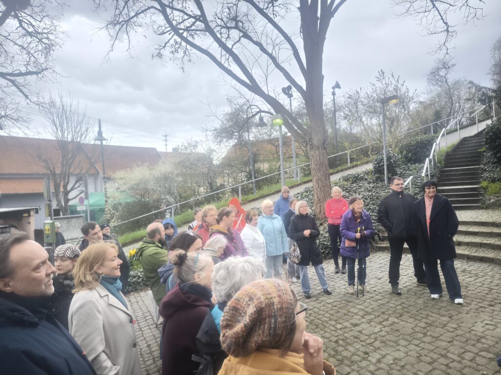 Von 1816 bis nach dem Krieg 1866 zwischen Preußen und Österreich mussten die Vetzberger in das „feindliche“ hessische Rodheim in die Schule und Kirche gehen. Auch wurden die Verstorbenen in Rodheim bestattet, dabei der Adel in der Kirche, die einfachen Leute außerhalb. Ernsthaft erwog man 1830, den gesamten Ort abzubrechen und am Fuß des Basaltkegels wieder neu aufzubauen, was aber nicht geschah. Von da aus ging es zurück durch den Torbogen zum alten Standort der Synagoge in Vetzberg. In Vetzberg bestand eine jüdische Gemeinde bis Ende des 19. Jahrhunderts. Ihre Entstehung geht in die Zeit des 15./17. Jahrhunderts zurück. Zeitweise betrug im 17. Jahrhundert der jüdische Bevölkerungsanteil am Ort bis zu 30 %. Sowohl einzelne Vetzberger Ganerben, als auch die Gemeinschaft der Ganerben hatten das Recht, Juden in ihren Schutz aufzunehmen. Ende des 17. Jahrhunderts kam aus Holland der jüdische Arzt Jehuda Löw nach Vetzberg. Er genoss großes Ansehen. In seinem Haus konnte auch ein Betsaal eingerichtet werden. Das heutige Wohnhaus liegt in der Mittelgasse, an ihrem Anfang, zwischen Ober- und Untergasse. Von dort ging es weiter in die Untergasse zum ehemaligen Haus des Schusters. Hier konnten die heutigen Besitzer zustimmen, zahlreiche Absätze bei graben im Garten gefunden zu haben. Eine Treppe führt direkt in die Obergasse. Oben angekommen kann man weit ins Tal schauen, bei guten Wetter sogar bis zum Feldberg. Über die Obergasse ging es dann zurück zum Vorplatz.